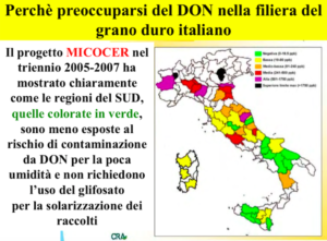 Nelle zone meridionali i livelli di DON sono sempre pressoché trascurabili. La conferma è arrivata dallo studio Micocer, uno dei primi progetti del Mipaaf (2006-2008) di “Valutazione e controllo della contaminazione da micotossine nelle produzioni cerealicole nazionali”. Dal monitoraggio delle produzioni nazionali di frumento duro di quel triennio è emerso che dai campi dislocati nel Sud/Isole, “i valori di DON in quest’ultimo areale sono pressoché trascurabili”.